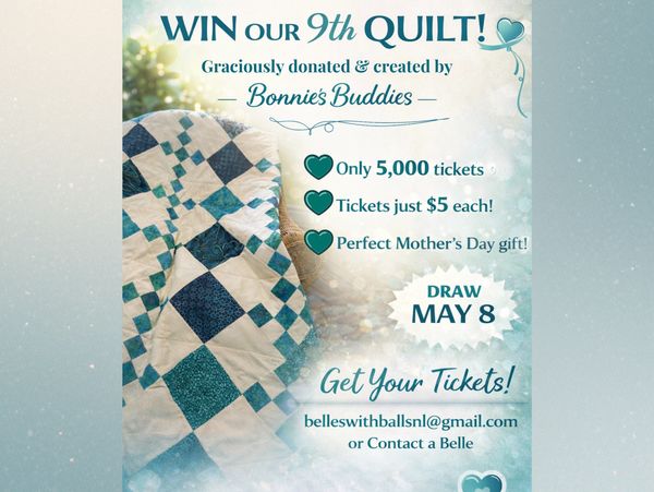 Bonnie's Buddies are a group of family and friends of Bonnie Morgan, an ovarian cancer patient and Co-Chair of Belles with Balls NL. Bonnie’s Buddies wanted to help Bonnie in her quest for better research and education of Ovarian Cancer in NL. They came together to create this beautiful expression of love and hope. This is the sixth quilt donated by this wonderful group of women. We thank them for their continued support, kindness, time and generosity. All monies raised by Belles with Balls NL are donated to the Ovarian Cancer Research and Education Fund at MUN.